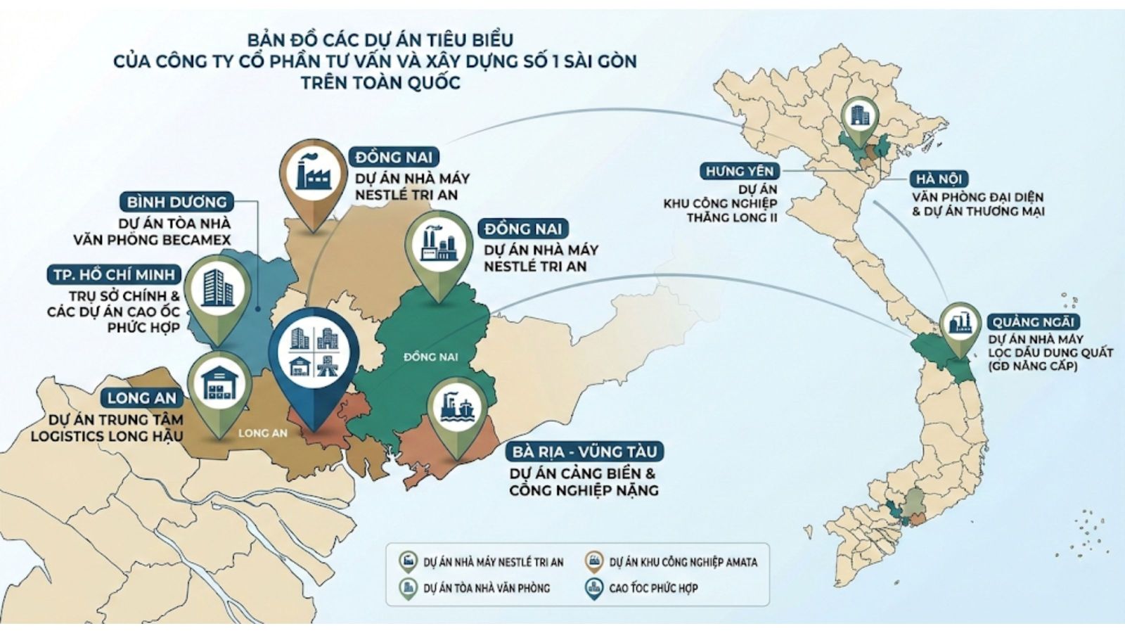 Tại Công ty Cổ phần Tư vấn và Xây dựng Số 1 Sài Gòn (No 1 Sài Gòn), mỗi dự án không chỉ là một công trình xây dựng, mà là một cam kết về sự Chính trực – Chất lượng – Hiệu quả. Với mạng lưới hoạt động trải dài từ miền Nam (Đồng Nai, Bình Dương, TP.HCM) ra miền Trung và miền Bắc (Hưng Yên), chúng tôi tự hào là đối tác chiến lược của các tập đoàn đa quốc gia và doanh nghiệp FDI hàng đầu.