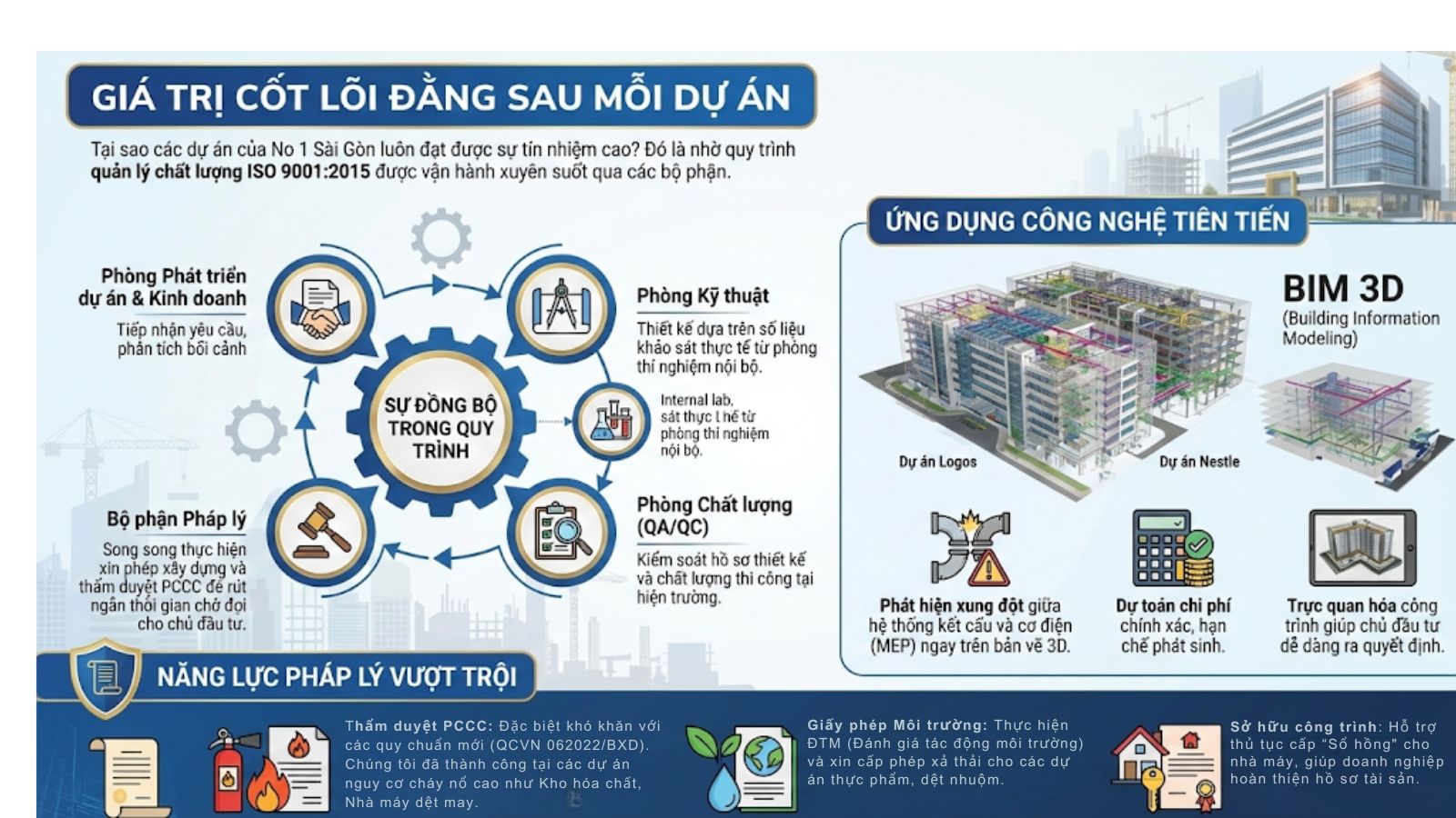 Chúng tôi áp dụng mô hình BIM (Building Information Modeling) vào các dự án lớn như Logos hay Nestle. Công nghệ này giúp: