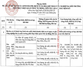 => Đối tượng, công trình, thiết bị xả bụi, khí thải và mức lưu lượng hoặc công suất phải quan trắc tự động, liên tục được quy định tại Phụ lục XXIX. Việc thực hiện quan trắc tự động, liên tục hoặc định kỳ của dự án thuộc loại hình sản xuất, kinh doanh có nguy cơ gây ô nhiễm môi trường được quy định như sau: