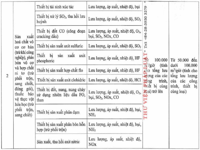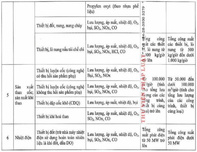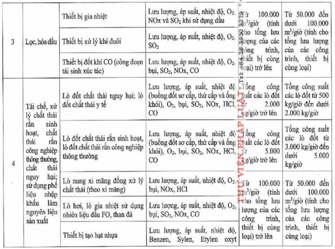 • Đối tượng tại Cột 2 có công trình, thiết bị xả bụi, khí thải tại Cột 3 với mức lưu lượng hoặc công suất tại Cột 5 thực hiện quan trắc tự động, liên tục quan trắc định kỳ;